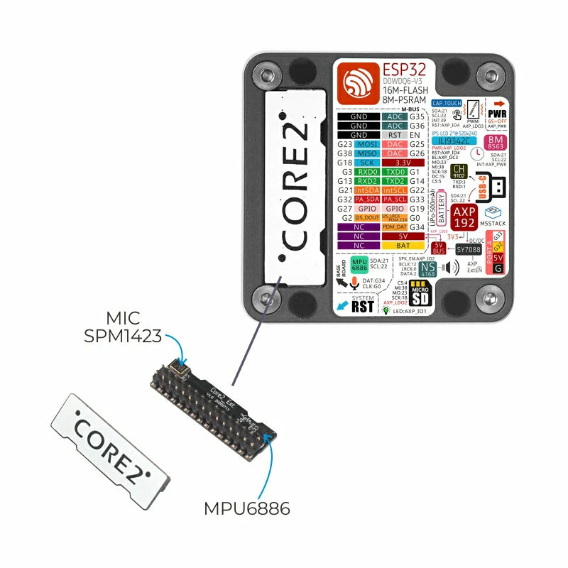 Core2 is the second generation main unit in the M5Stack development kit series, further enhancing the functionality of the original first-generation main unit with more comprehensive hardware features. The core controller Core2 is equipped with ESP32-D0WDQ6-V3, featuring two independently controllable Xtensa® 32-bit LX6 processors with a main frequency of up to 240 MHz, supporting Wi-Fi functionality. It has onboard 16MB Flash and 8MB PSRAM, and programs can be downloaded via the USB Type-C interface. Its powerful configuration meets the resource demands of complex applications. The front is equipped with a 2.0-inch integrated capacitive touch screen, providing users with a smoother human-computer interaction experience.